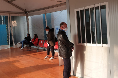 La tensostruttura, che riesce a coprire alcune decine di metri di marciapiede in accesso, è dotata di stufe elettriche e di sedute nel punto prossimo al prelievo e toilettes chimiche.